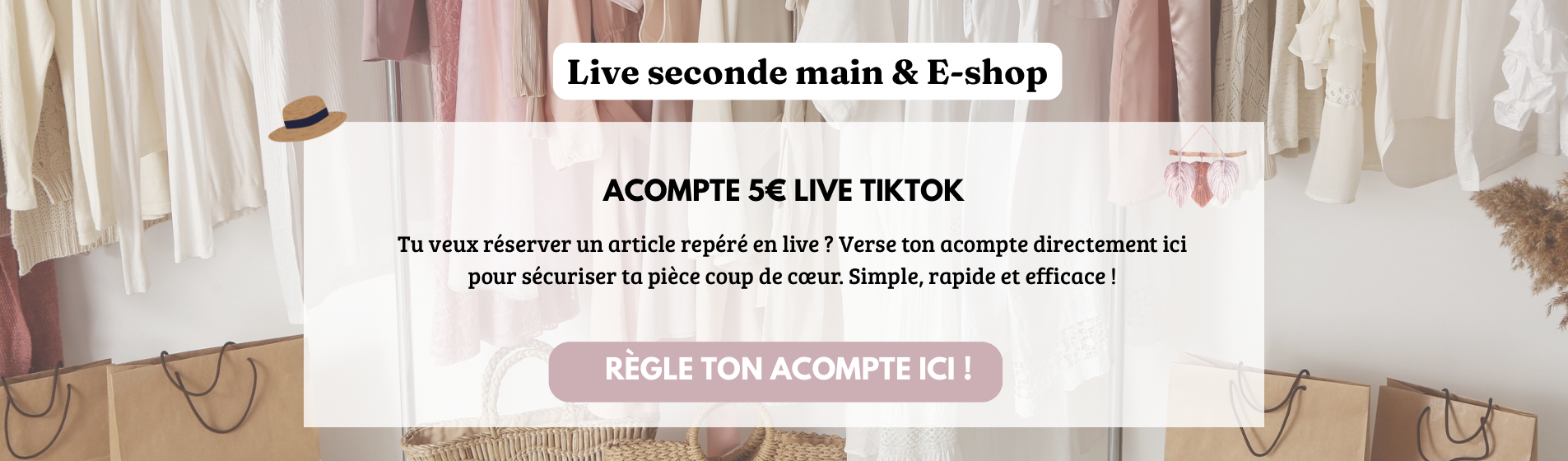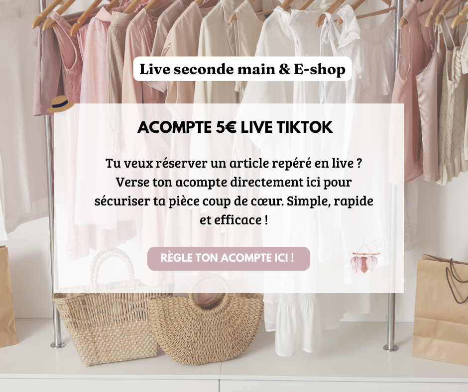 Mes sélections, soigneusement choisies, allient style, tendance et respect de l’environnement. Rejoignez mes ventes en live sur TikTok ! Si une pièce vous plaît, un acompte de 5 € vous permettra de la réserver, déduit bien sûr du montant final de l’achat.
