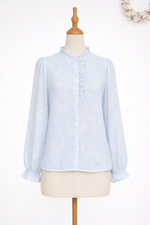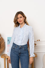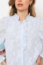 Détails volants au col et manches légèrement bouffantes pour un rendu féminin et chic.