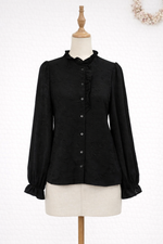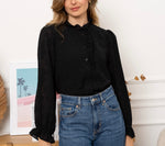 Détails volants au col et manches légèrement bouffantes pour un rendu féminin et chic.