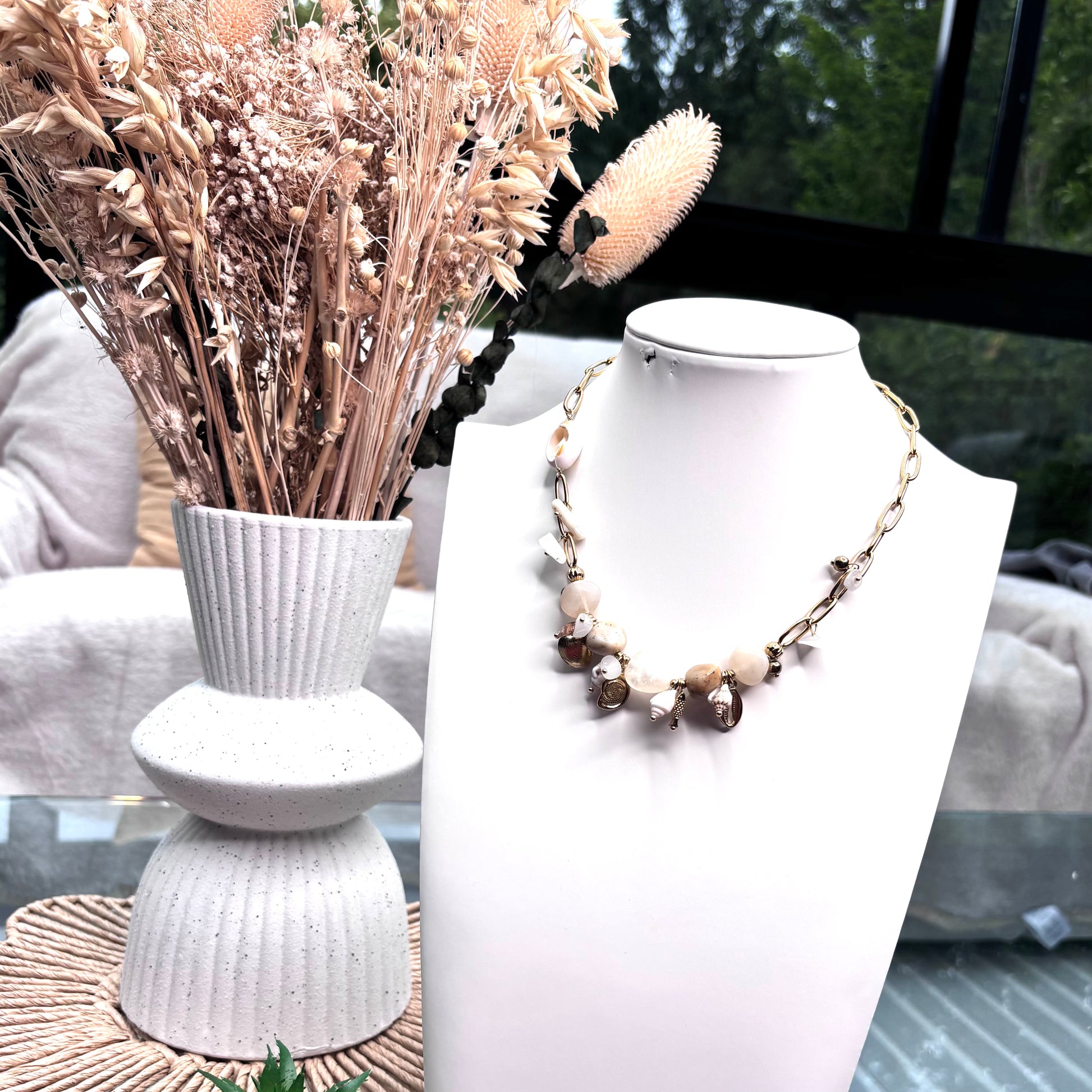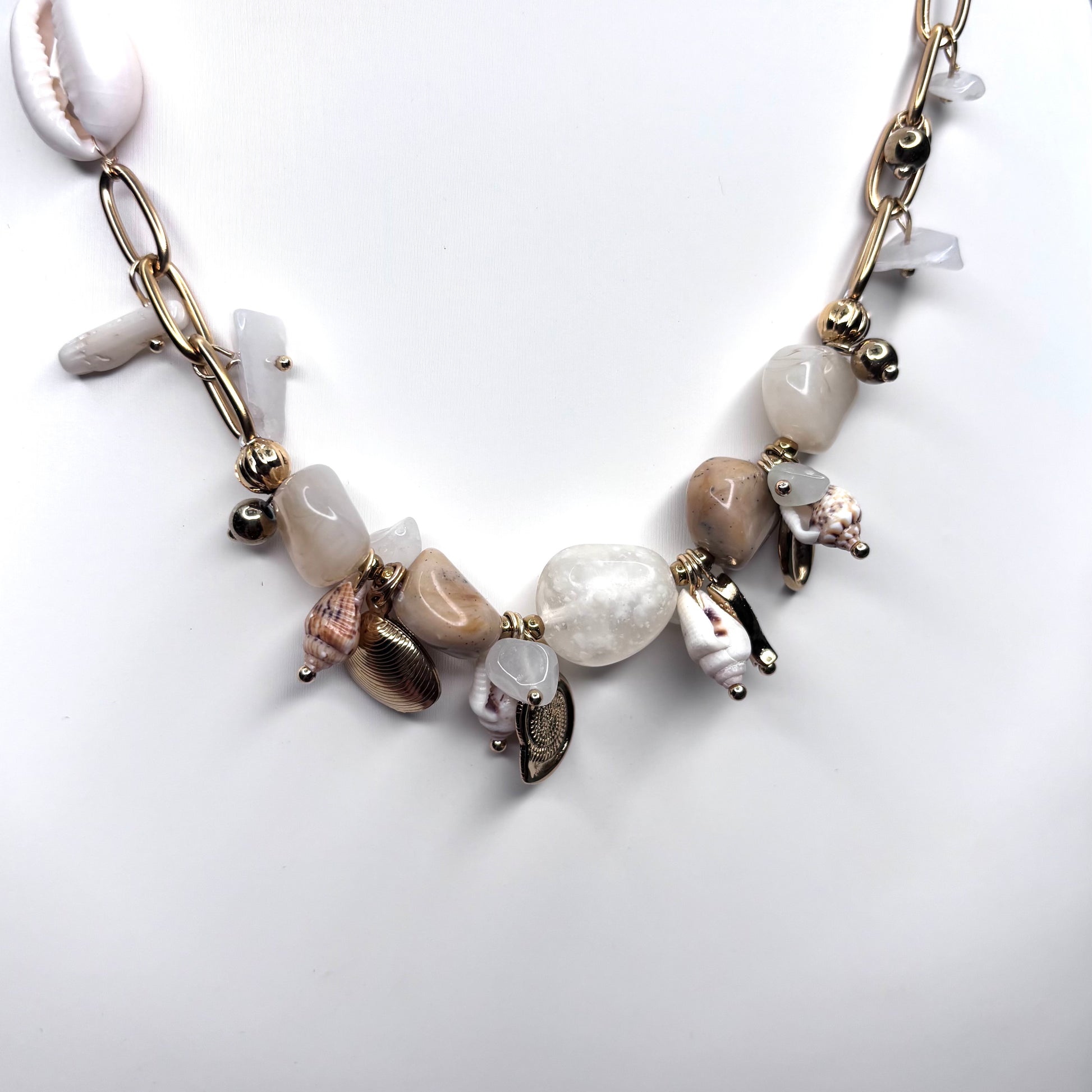 Ce collier doré en acier inoxydable est un véritable hommage à la nature marine. Il associe des maillons larges à une composition unique de coquillages naturels, pierres semi-précieuses et breloques dorées en forme de coquilles. Le mélange de textures et de teintes sableuses lui donne un charme authentique et bohème, parfait pour sublimer vos tenues estivales.