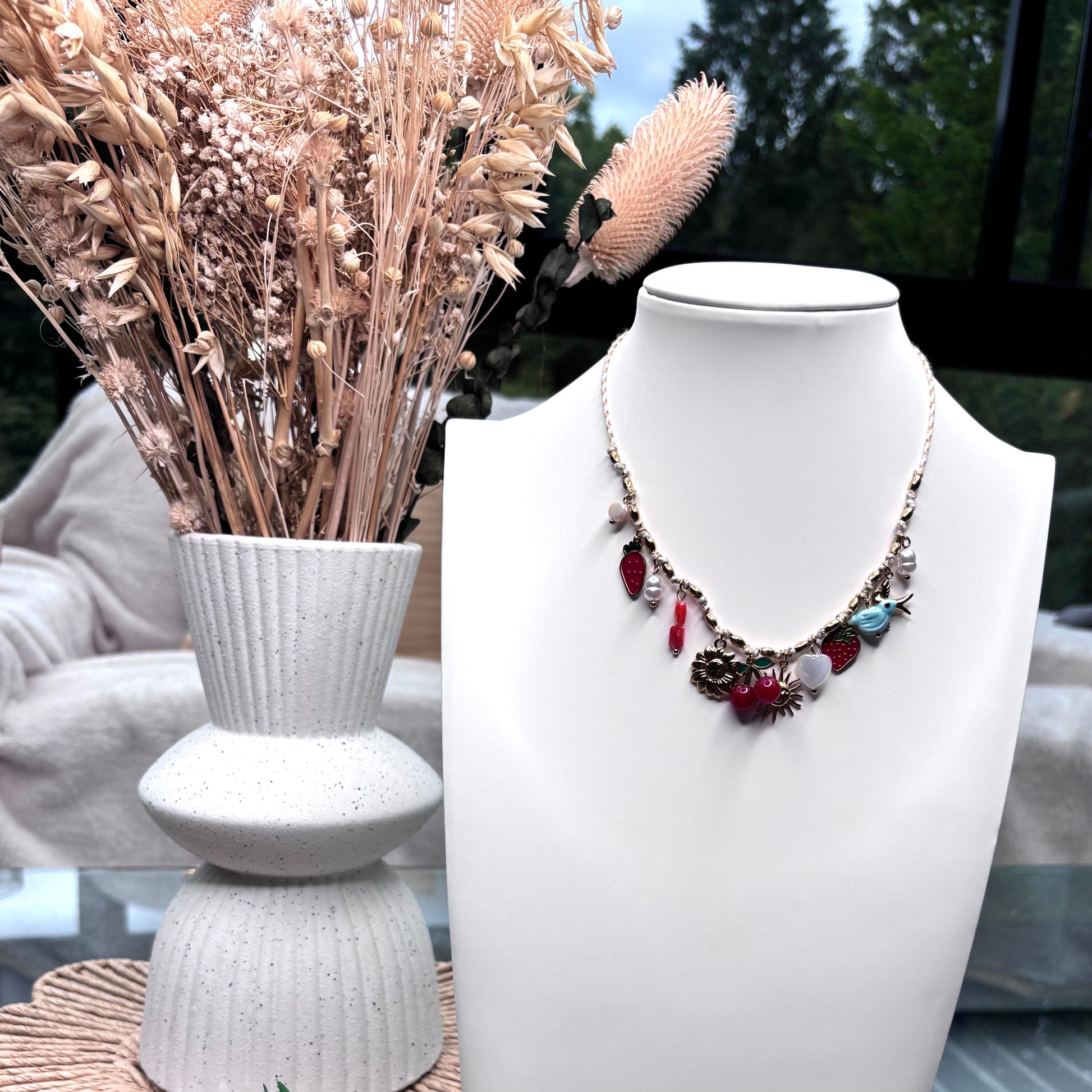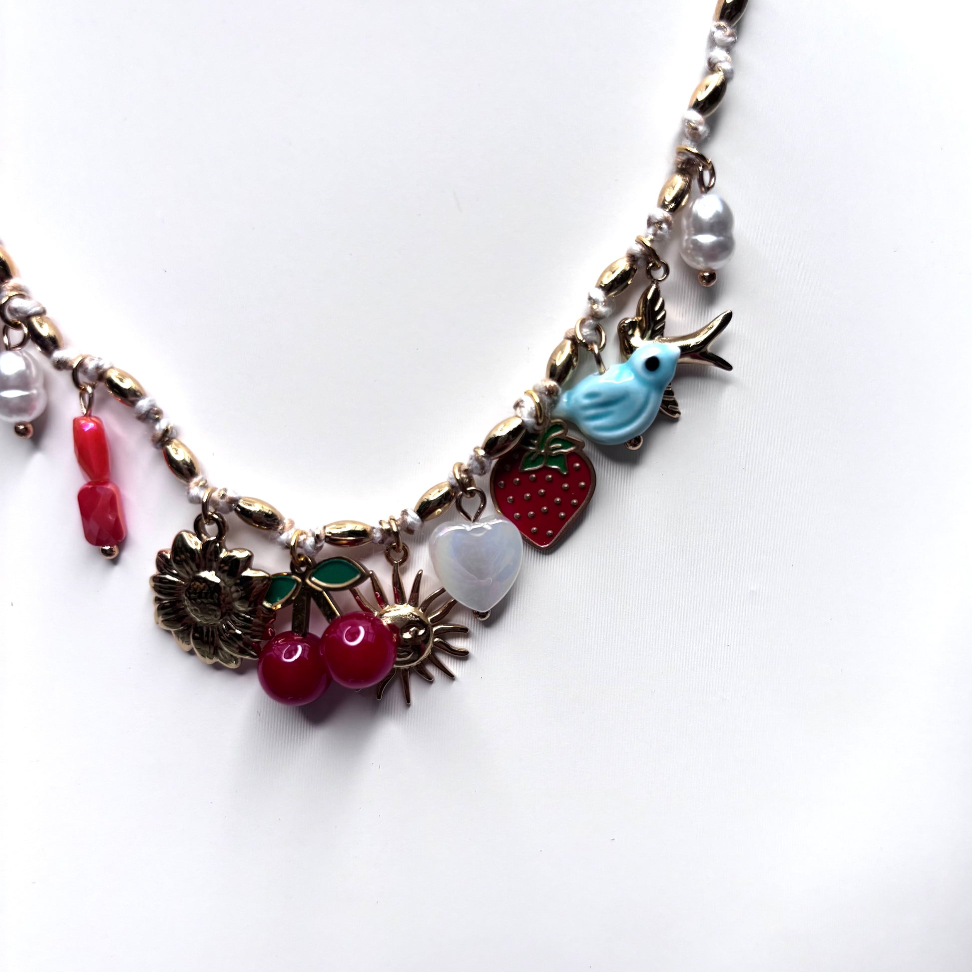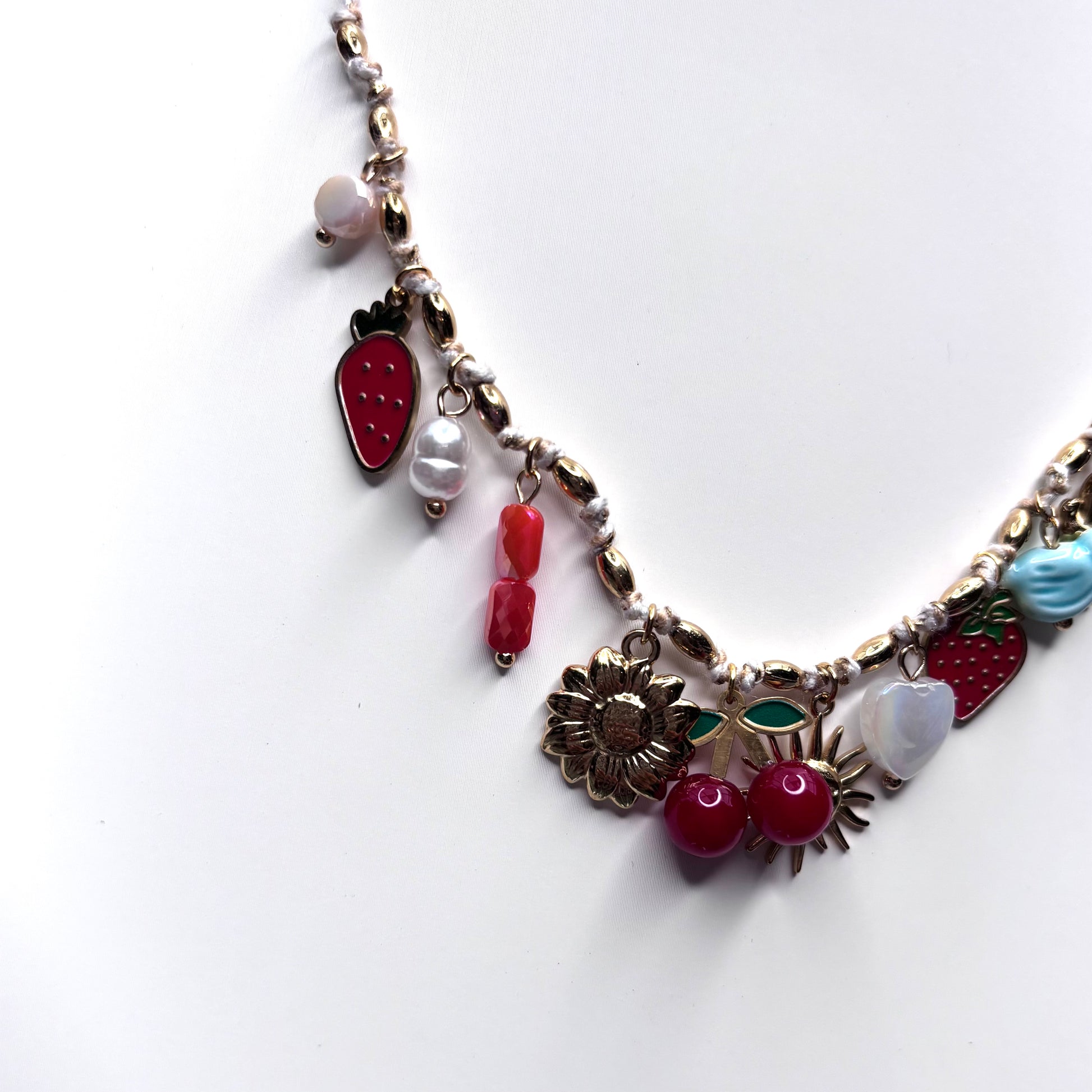 Ce collier unique allie fantaisie et éclat solaire, monté sur un cordon tressé blanc finement travaillé. Chaque breloque évoque une ambiance estivale : cerises vernies, fraises émaillées, soleil doré rayonnant, poisson turquoise, perles nacrées et pierres colorées viennent rythmer cette piÚce pleine de vie. Le tout est suspendu sur une base élégante aux perles dorées irréguliÚres, créant un contraste raffiné avec le cÎté ludique des pendentifs.